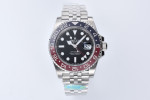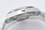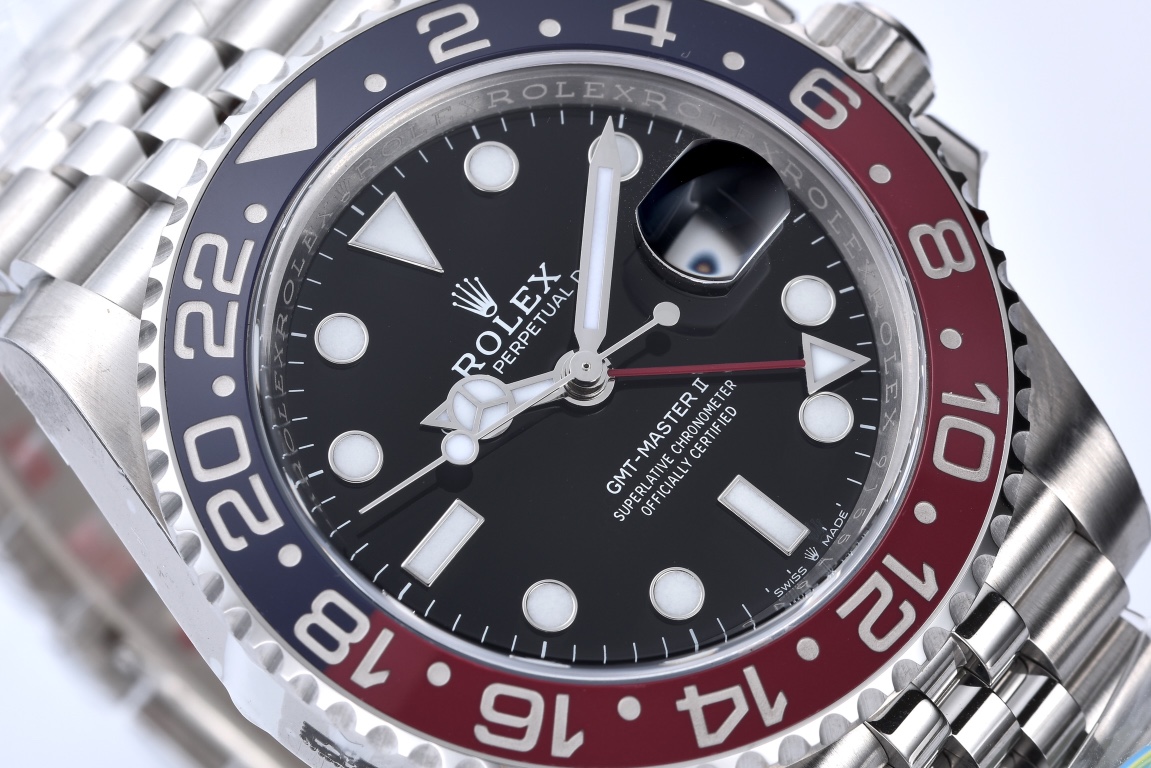 24시간 눈금이 새겨진 양방향 회전 베젤. 블루 및 레드 세라믹 소재의 투톤 세라크롬 인서트, 몰딩된 숫자와 눈금